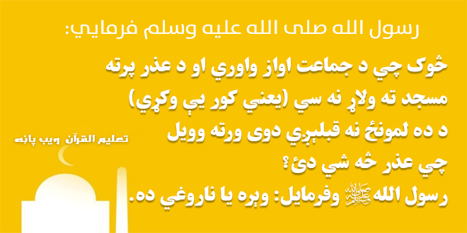 | عن ابن عباس رضی الله عنه قال قال رسول الله صلی الله علیه وسلم من سمع الندآء فلم يمنعه من اتباعه عذر قالوا وما العذر قال خوف اومرض لم تقبل منه الصلوة التي صلي([1]). | ژباړه : ابن عباس رضی الله عنه روايت کړى دئ، چي رسول الله صلی الله علیه وسلم فرمايلي دي څوک چي د جماعت اواز واوري او د عذر پرته مسجد ته ولاړ نه سي (يعني کور يې وکړي) د ده لمونځ نه قبلېږي دوى ورته وويل چي عذر څه شي دئ؟ رسول الله صلی الله علیه وسلم وفرمايل: وېره يا ناروغي ده. |