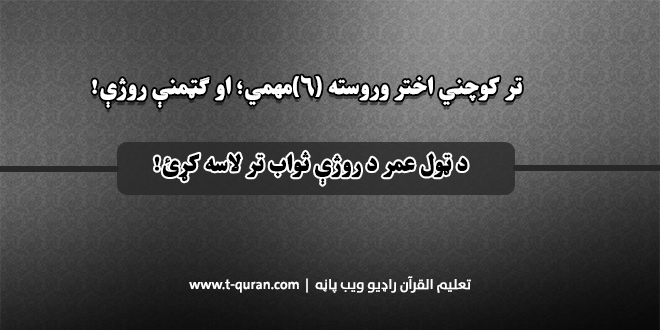 که چا د رمضان د میاشتي روژه ونیول بیا یې ورپسې د کوچني اختر د میاشتي شپږ نوري روژې ونیولې ثواب یې دومره زیات دئ لکه ټول عمر چي روژه ونیسي. (رواه مسلم)