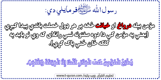 رسول الله صلی الله علیه وسلم فرمایلي دي: مؤمن بېله درواغ او خیانت څخه پر هر ډول خصلت باندي پیدا کیږي (یعني په مؤمن کي دا دوه صفتونه نسي راتلای که وي نو باید په کلکه ځان ځني پاک کړي).