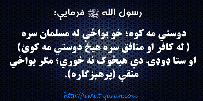 دوستي مه کوه؛ خو یواځې له مسلمان سره ( له کافر او منافق سره هیڅ دوستي مه کوئ) او ستا ډوډۍ دې هیڅوک نه خوري؛ مګر یواځي متقي (پرهېزګاره).