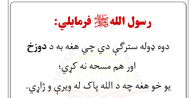 دوه ډوله سترګې دي چي هغه به د دوزخ اور هم مسحه نه کړي یو خو هغه چه د الله پاک له ويرې و ژاړي او دوهـم هغه سترګې چي د الله په لاره کې د پیـرې کـولـو په خـاطـر بيداره اوسيږي.