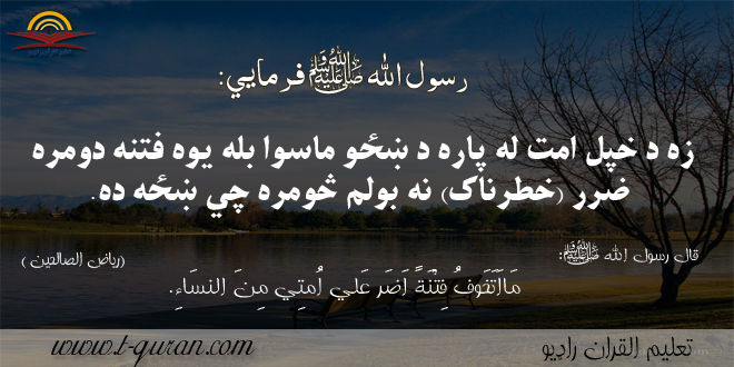 ترجمه : زه د خپل امت له پاره د ښځو ماسوا بله يوه فتنه دومره ضرر (خطرناک) نه بولم څومره چي ښځه ده.