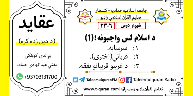 د دین زده کړې لړۍ(عقاید) شږم درس: وړاندي کوونکی: مفتي عبدالهادي حماد د شپږم درس ویډیوي بڼه: https://youtu.be/5JpshxsuLi0