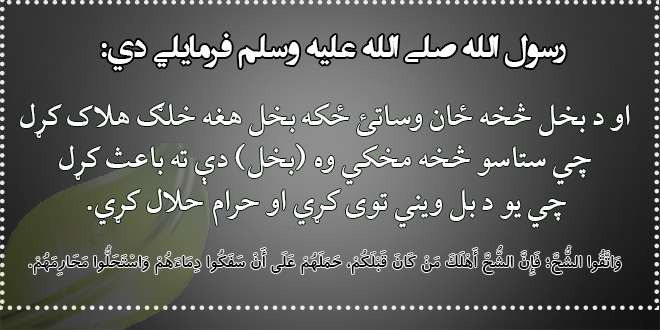 او د بخل څخه ځان وساتئ ځکه بخل هغه خلګ هلاک کړل چي ستاسو څخه مخکي وه (بخل) دې ته باعث کړل چي یو د بل ویني توی کړي او حرام حلال کړي.