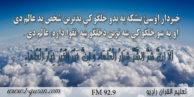 ترجمه : خبردار اوسئ بيشكه په بدو خلګو كي بدترين شخص بد عالم دى او په ښو خلګو كي ښه ترين دخلګو ښه (تقوا داره) عالم دى .مشكوة