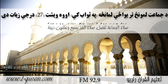 ترجمه : د جماعت لمونځ تر يواځي لمانځه (په ثواب كي) اووه ويشت (۲۷) درجي زيات دى .  مشكوة ج ۱ صـ ۸۵،