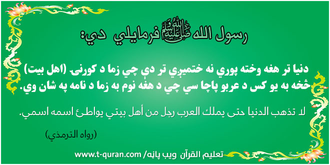 رسول الله صلى الله عليه و سلم فرمایلي دي: دنیا تر هغه وخته پوري نه ختمیږي تر دې چي زما د کورنۍ (اهل بیت) څخه به یو کس د عربو پاچا سي چي د هغه نوم به زما د نامه په شان وي.