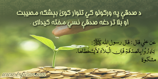 ترجمه : د صدقې په وركولو كي تلوار كوئ بېشكه مصيبت او بلا تر دغه صدقې نسي مخته كيدلاى .مشكوة صـ ۱۶۷.