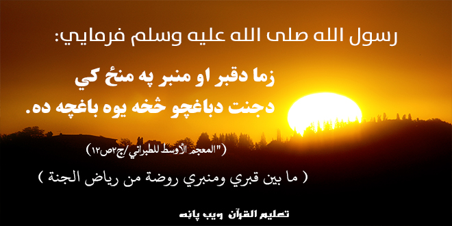 ژباړه: زما دقبر او منبر په منځ کي دجنت دباغچو څخه یوه باغچه ده.[“المعجم الأوسط للطبراني/ج2ص12/0]