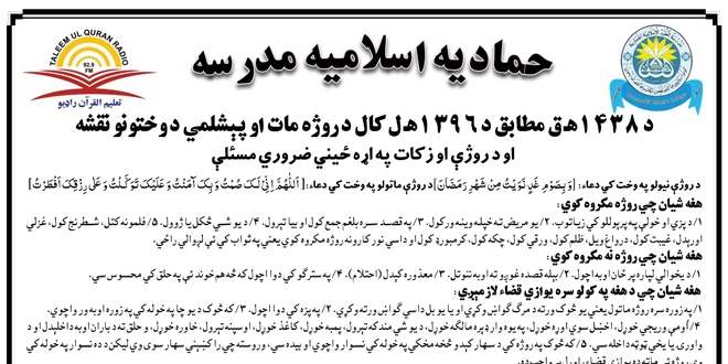 د روژه مات او پیشلمي وختونه او د روژي او زکات اړوند ضروري مسئلي مې 26, 2017 چاڼ سوي مضامین 2,525 لیدنی شریکول Facebook Google +