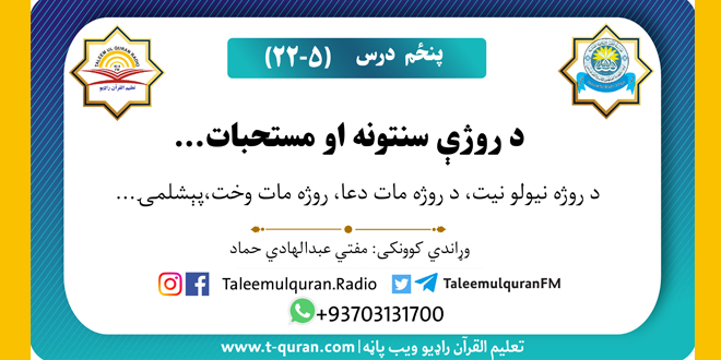 پنځم درس: وړاندي کوونکی: مفتي عبدالهادي حماد د پنځم درس ویډیویي بڼه: https://youtu.be/s8dtnv_gAck