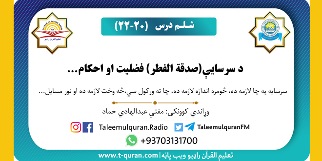 شلم درس: وړاندي کوونکی: مفتي عبدالهادي حماد د شلم درس ویډیویي بڼه: https://youtu.be/dKmhY_odKSQ