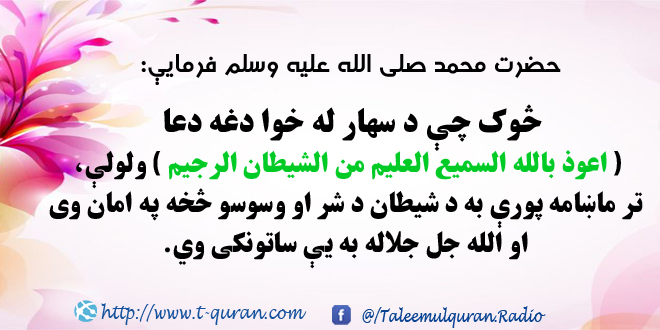 څوﮎ چې ﺩ سهاﺭ له ﺧﻮﺍ ﺩغه ﺩﻋﺎ ( اﻋﻮﺫ بالله السمیع ﺍﻟﻌﻠﯿﻢ ﻣﻦ الشیطان ﺍﻟﺮﺟﯿﻢ ) ﻭﻟﻮلې، ﺗﺮ ﻣﺎښامه ﭘﻮﺭې به ﺩ ﺷﯿﻄﺎﻥ د شر او وسوسو څخه په ﺍﻣﺎﻥ ﻭﯼ ﺍﻭ الله ﺟﻞ ﺟﻼله به یې ﺳﺎﺗﻮنکی ﻭي.