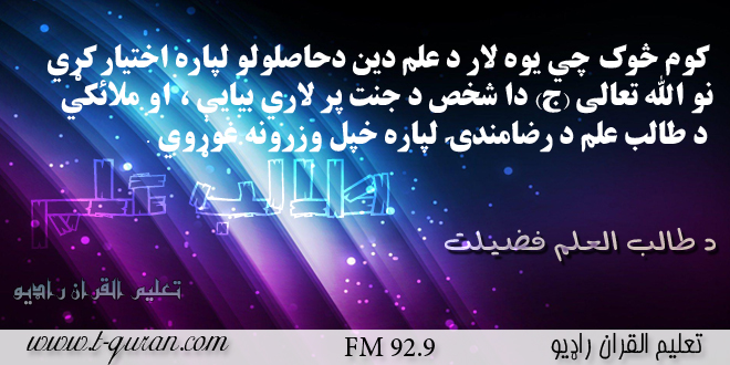ترجمه : كوم څوك چي يوه لار د علم دين دحاصلولو لپاره اختيار كړي نو الله تعالى (ج) دا شخص د جنت پر لاري بيايې ، او ملائكي د طالب علم د رضامندۍ لپاره خپل وزرونه غوړوي .  مشكوة ج ۱ صـ ۳۴.