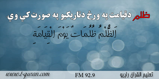 د ظلم څخه ځان ساتل : اَلظُّلْمُ ظُلُمَاتٌ يَوْمَ الْقِيَامَةِ ترجمه : ظلم دقيامت په ورځ دتاريكيو په صورت كي وي. مشكوة ج ۲ صـ ۴۳۴.