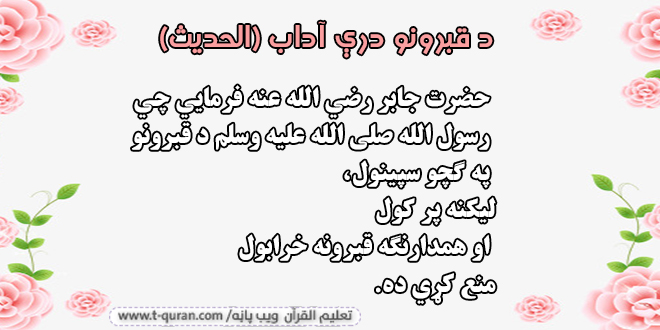 حضرت جابر رضي الله عنه فرمايي چي رسول الله صلی الله علیه وسلم د قبرونو په ګچو سپينول، لیکنه پر کول او همدارنګه قبرونه خرابول منع کړي ده.