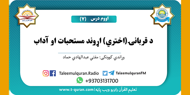 اووم درس: وړاندي وونکی: مفتي عبدالهادي حماد د اووم درس ویډیویي بڼه: https://youtu.be/uv_bTqUEHCs دا هم ولولی: https://www.t-quran.com/قرباني-د-سنتو-په-رڼاکې/