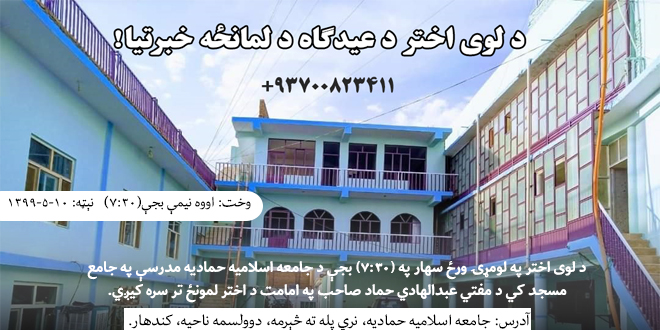 د لوی اختر په لومړی ورځ سهار په (۷:۳۰) بجې د جامعه اسلامیه حمادیه مدرسې په جامع مسجد کي د مفتي عبدالهادي حماد صاحب په امامت د اختر لمونځ تر سره کیږي.