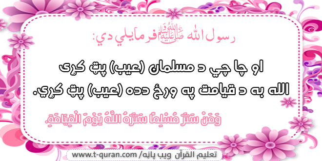 ژباړه: او چا چي د مسلمان (عیب) پټ کړی الله به د قیامت په ورځ دده (عیب) پټ کړي.