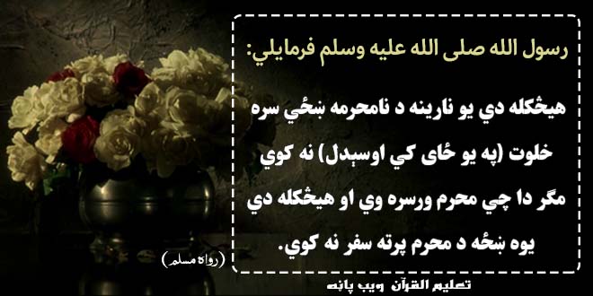 افضل الانبیاء صلی الله علیه وسلم فرمایلي دي:هیڅکله دي یو نارینه د نامحرمه ښځي سره خلوت (په یو ځای کي اوسېدل) نه کوي مګر دا چي محرم ورسره وي او هیڅکله دي یوه ښځه د محرم پرته سفر نه کوي.