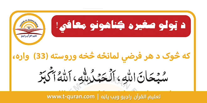 که څوک د هر فرضي لمانځه څخه وروسته درو دېرش (٣٣) واره سُبْحَانَ اللهِ ، اَلْحَمْدُلِلّٰهِ ، اَللهُ اَکْبَرْ او یو وار دغه لاندي کلمه ووايي الله’ به یې ټولي صغیره گناوي ور معاف کړي: