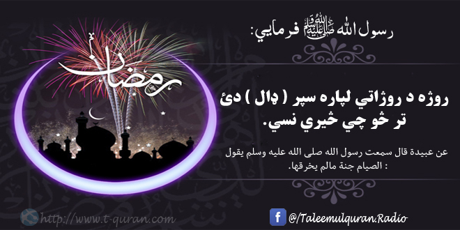 | عن عبيدة قال سمعت رسول الله صلی الله علیه وسلم يقول الصيام جنة مالم يخرقها. ([1]) | ژباړه: رسول الله صلی الله علیه وسلم فرمايي : روژه د روژاتي لپاره سپر ( ډال ) دئ تر څو چي څيري نسي. |