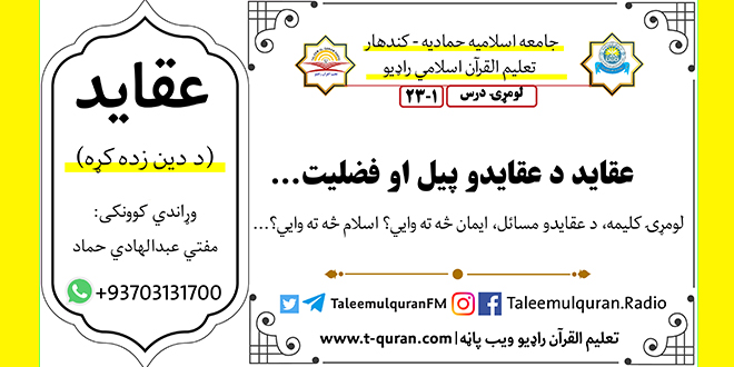د دین زده کړه(عقاید) لومړۍ درس: وړاندي کوونکی: مفتي عبدالهادي حماد د لومړي درس ویډیوي بڼه: https://www.youtube.com/watch?v=5TEZayb8Ojs