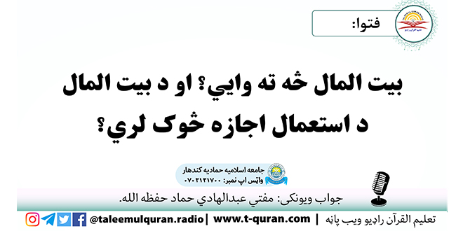 فتوا: بیت المال څه ته وایي؟ او د بیت المال د استعمال اجازه څوک لري؟ نوومبر 2, 2021 ستاسو شرعی پوښتنی او جوابونه, علم 1,582 لیدنی جواب ويونکی: مفتي عبدالهادي حماد شریکول Facebook Google +