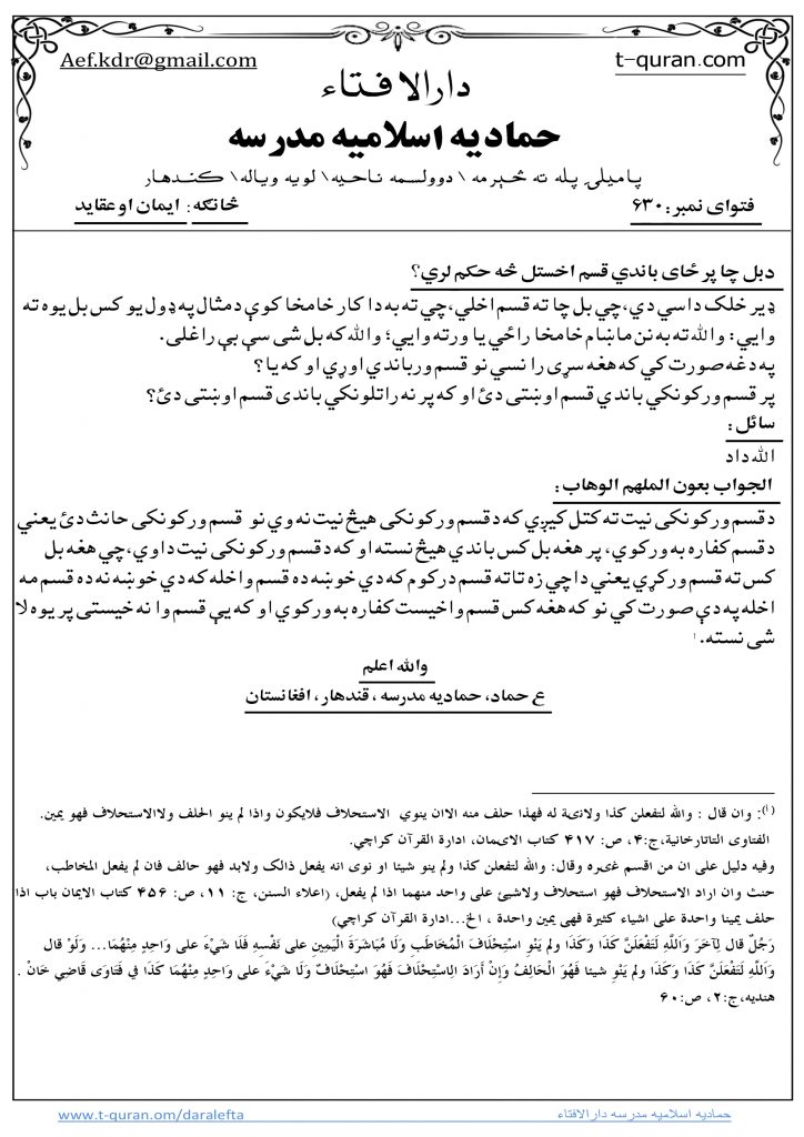فتوا: دبل چا پر ځای باندي قسم اخستل څه حکم لري؟