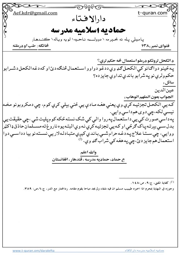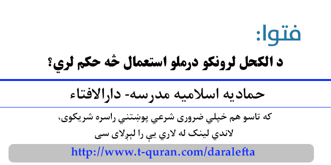 فتوا: د الکحل لرونکو درملو استعمال څه حکم لري؟ نوومبر 4, 2017 ستاسو شرعی پوښتنی او جوابونه, طب او درملنه 1,320 لیدنی کولای سی لاندي فتوا باندي راسته کلیک وکړئ او خپل کمپیوټر کښې يې ثبت کړئ شریکول Facebook Google +