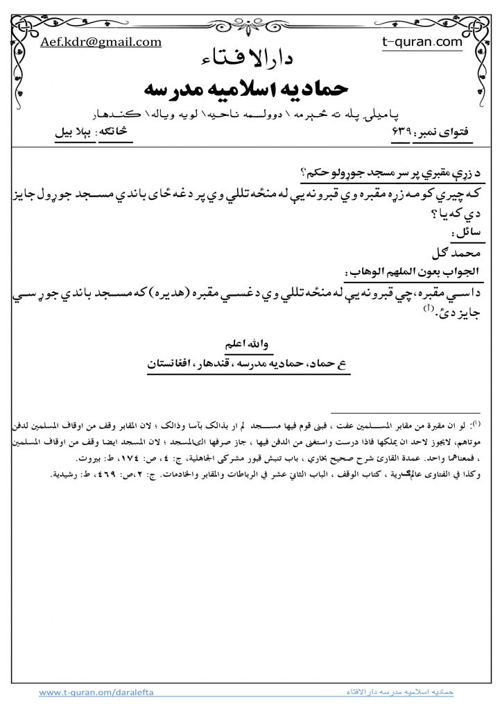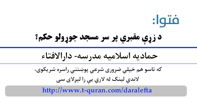 فتوا: د زړې مقبري پر سر مسجد جوړولو حکم؟ نوومبر 5, 2017 بیلا بیل, ستاسو شرعی پوښتنی او جوابونه 1,196 لیدنی کولای سی لاندي فتوا باندي راسته کلیک وکړئ او خپل کمپیوټر کښې يې ثبت کړئ شریکول Facebook Google +