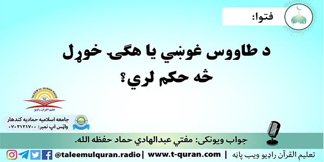 جواب ويونکی: مفتي عبدالهادي حماد د تعلیم القرآن راډيو ویب پاڼې یوټیوب چینل هم وګوری https://youtu.be/VB32ae7d40U