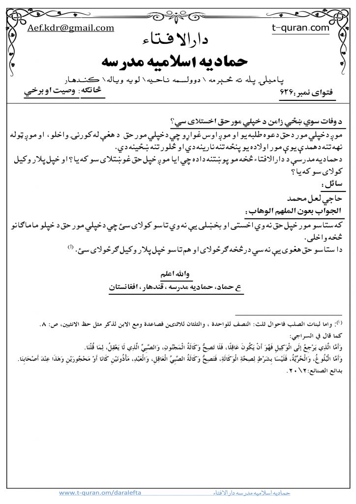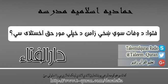 جواب ويونکی: مفتي عبدالهادي حماد. ستاسو د شرعي پوښتنو جوابونه کوم چي مو د حمادیه …