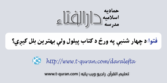 فتوا: د چهار شنبې په ورځ د کتاب پیلول ولې بهترین بلل کیږي؟ جون 16, 2020 ستاسو شرعی پوښتنی او جوابونه, علم 1,498 لیدنی کولای سی لاندي فتوا باندي راسته کلیک وکړئ او خپل کمپیوټر کښې يې ثبت کړئ شریکول Facebook Google +