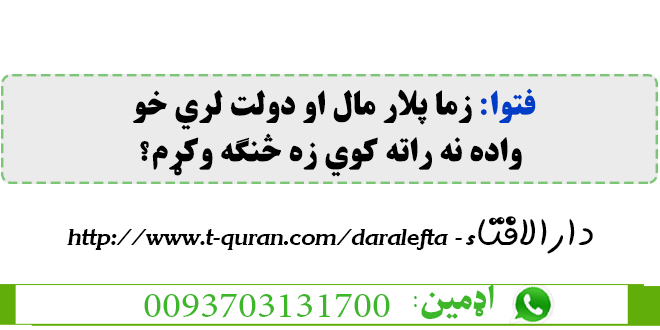 فتوا: زما پلار مال او دولت لري خو واده نه راته کوي زه څنګه وکړم؟ جولای 5, 2020 ستاسو شرعی پوښتنی او جوابونه, نکاح 1,558 لیدنی جواب ويونکی: مفتي عبدالهادي حماد حفظه الله شریکول Facebook Google +