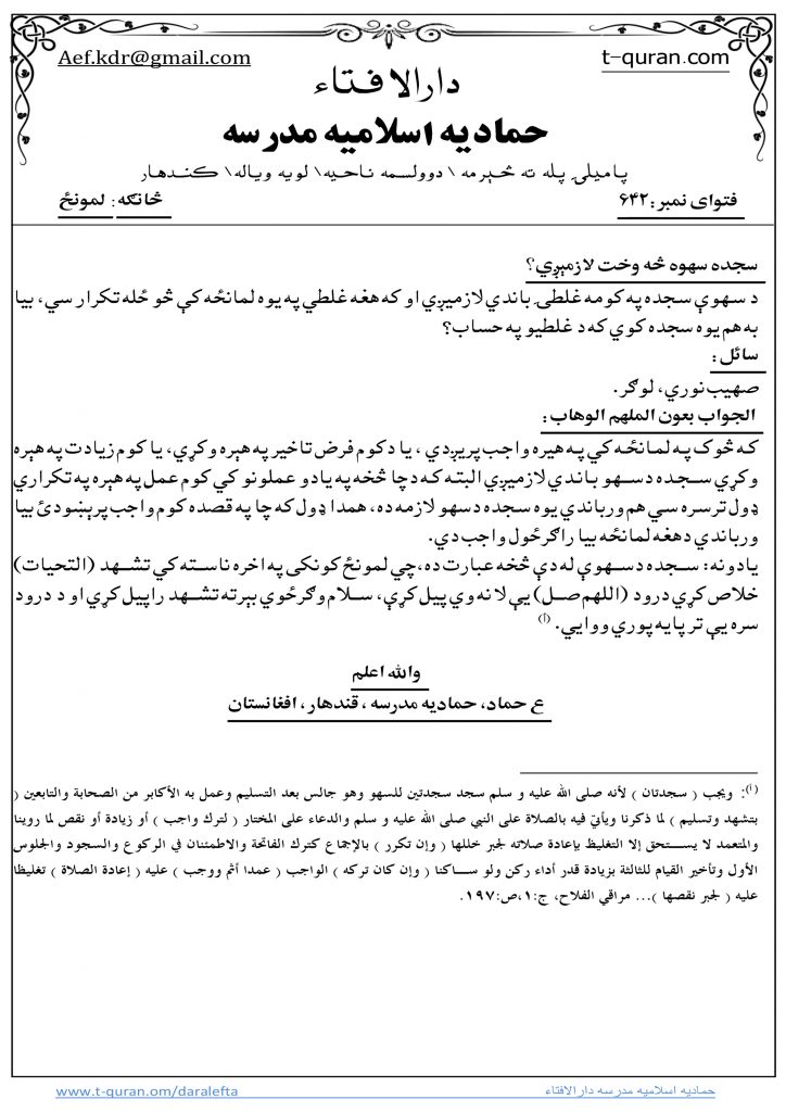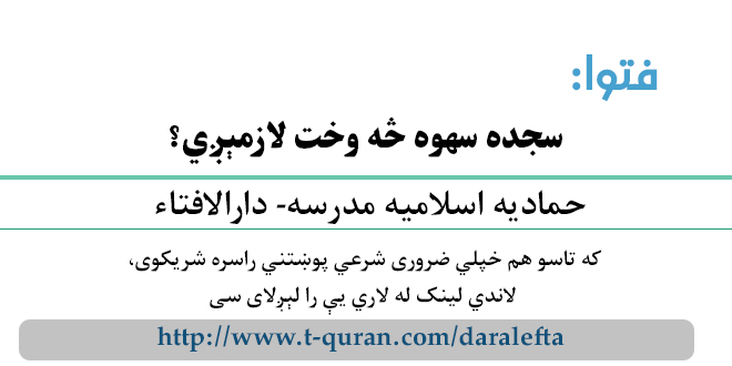 فتوا: سجده سهوه څه وخت لازمېږي؟ نوومبر 19, 2017 ستاسو شرعی پوښتنی او جوابونه, لمونځ 1,740 لیدنی کولای سی لاندي فتوا باندي راسته کلیک وکړئ او خپل کمپیوټر کښې يې ثبت کړئ شریکول Facebook Google +