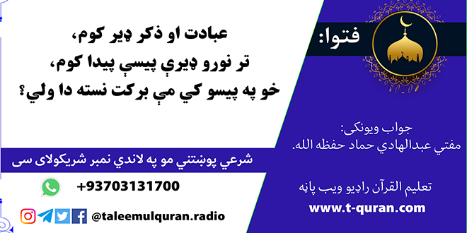 جواب ويونکی: مفتي عبدالهادي حماد د همدې فتوا ویډیویي بڼه د تعلیم القرآن راډیو په یوټیوب چینل هم کتلای سی: https://youtu.be/8nd_BOHpEvo