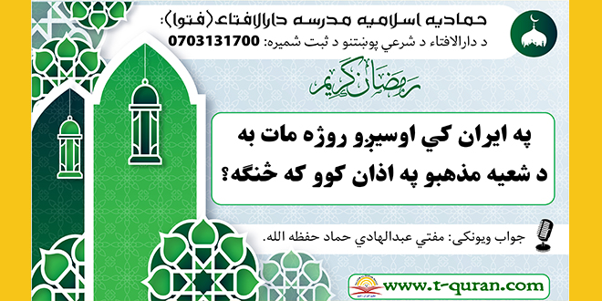 فتوا: په ایران کي اوسیږو روژه مات به د شعیه مذهبو په اذان کوو که څنګه؟ اپریل 28, 2021 روژه, ستاسو شرعی پوښتنی او جوابونه 786 لیدنی جواب ويونکی: مفتي عبدالهادي حماد شریکول Facebook Google +