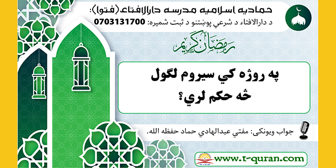 فتوا: په روژه کي سیروم لګول څه حکم لري؟ اپریل 27, 2021 روژه, ستاسو شرعی پوښتنی او جوابونه 1,525 لیدنی جواب ويونکی: مفتي عبدالهادي حماد شریکول Facebook Google +