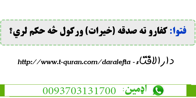 فتوا: کفارو ته صدقه (خیرات) ورکول څه حکم لري؟ جولای 12, 2020 روا او ناروا, ستاسو شرعی پوښتنی او جوابونه 1,384 لیدنی جواب ويونکی: مفتي عبدالهادي حماد حفظه الله شریکول Facebook Google +