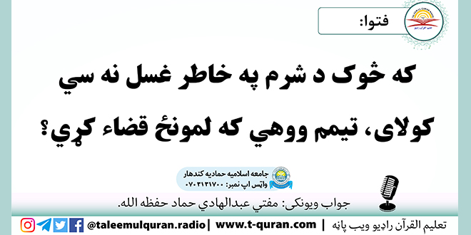 مخپاڼه / ستاسو شرعی پوښتنی او جوابونه / فتوا: که څوک د شرم په خاطر غسل نه سي کولای، تیمم ووهي که لمونځ قضاء کړي؟