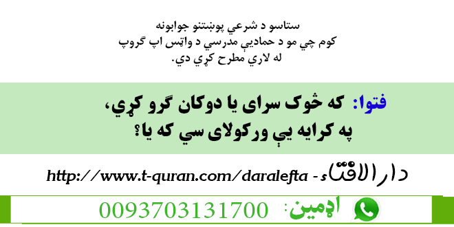 فتوا: که څوک سرای یا دوکان ګرو کړي، په کرایه یې ورکولای سي که يا؟ جون 14, 2020 ستاسو شرعی پوښتنی او جوابونه, ګروي 1,923 لیدنی جواب ويونکی: مفتي عبدالهادي حماد (حفظه الله) شریکول Facebook Google +