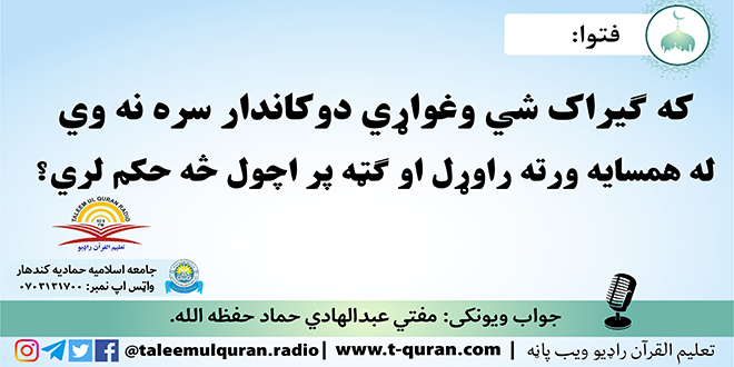 جواب ويونکی: مفتي عبدالهادي حماد د تعلیم القرآن راډیو د یوټیوب چینل هم سبسکرایب کړی https://youtu.be/c6Vk1VG44wA