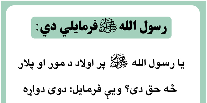 حضرت ابي امامه رضي الله عنه فرمايي چي یوه شخص وویل: یا رسول الله (صلی الله علیه وسلم) پر اولاد د مور او پلار څه حق دی؟ ويې فرمایل: دوی دواړه (مور او پلار) ستا جنت هم دی او ستا جهنم هم دی.