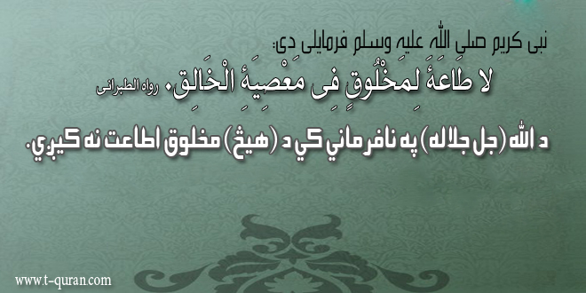 نبي کریم صلی الله علیه وسلم فرمایلي دي: لا طَاعَةَ لِمَخْلُوقٍ فِي مَعْصِيَةِ الْخَالِق. رواه الطبراني في الکبیر و احمد و مصنف ابن ابي شیبة