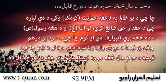ترجمه: د حضرت ابن عباس (رض) څخه روايت دئ، چي نبي کريم (ص) وفرمايل: چا چي د يو ظالم په ناحقه حمايت (کومک) وکړ، د دې لپاره چي د حقدار حق ضايع کړي، نو الله ‘ او د هغه رسول (ص) د ده څخه بري (بېزاره) دي او کوم چا چي د سود يو درهم وخوړی نو دا د دېرش واره زنا سره برابر دئ او د کوم چا چي غوښه د حرام مال څخه جوړه (پيدا) سوې وي هغه د دوږخ قابل ده.
