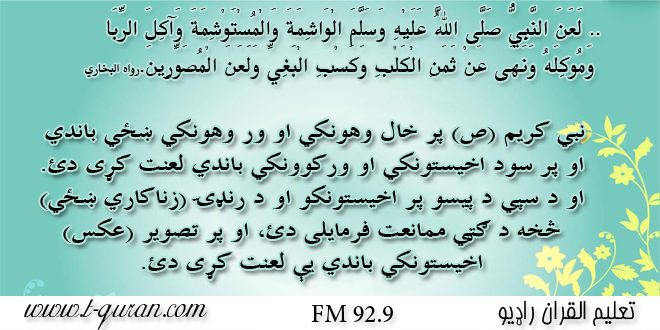 ترجمه: حضرت عون بن ابي جحيفه (رض) د خپل پلار څخه روايت کوي، چي نبي کريم (ص) پر خال وهونکي او ور وهونکي ښځي باندي او پر سود اخيستونکي او ورکوونکي باندي لعنت کړی دئ. او د سپي د پيسو پر اخيستونکو او د رنډۍ (زناکاري ښځي) څخه د ګټي ممانعت فرمايلی دئ، او پر تصوير (عکس) اخيستونکي باندي يې لعنت کړی دئ.