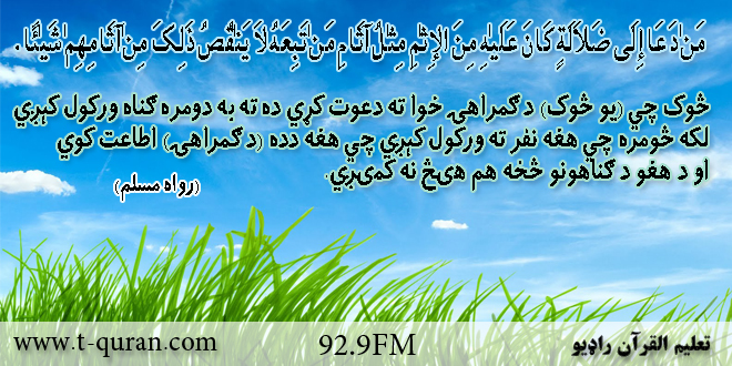 ژباړه: څوک چي (یو څوک) د ګمراهۍ خوا ته دعوت کړي ده ته به دومره ګناه ورکول کیږي لکه څومره چي هغه نفر ته ورکول کیږي چي هغه دده (د ګمراهۍ) اطاعت کوي او د هغو د ګناهونو څخه هم هیڅ نه کمیږي.