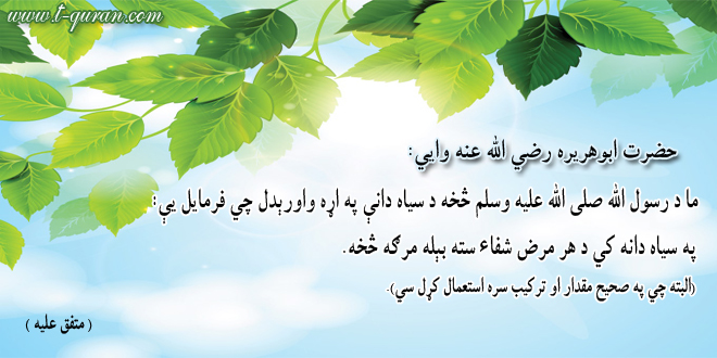 حضرت ابوهریره رضي الله عنه وايي ما د رسول الله صلی الله علیه وسلم څخه د سياه دانې په اړه واورېدل چي فرمايل يې: په سیاه دانه کي د هر مرض شفاء سته بېله مرګه څخه. (البته چي په صحیح مقدار او ترکیب سره استعمال کړل سي). متفق عليه
