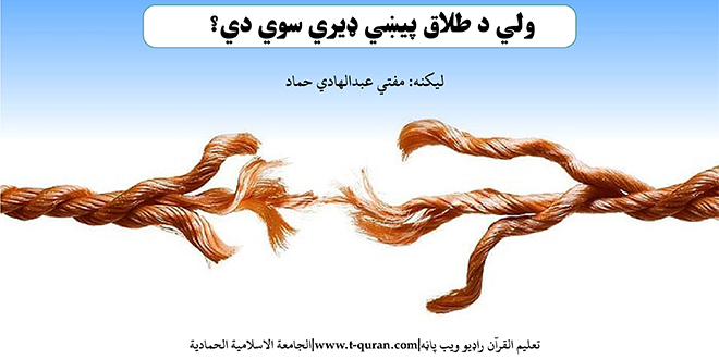 زموږ دارالافتاء ته په هرو درو ورځو کي د طلاق یوه موضوع راځي، خاوند ، یا مېرمن او یا هم دواړه یو له بله جلاوالی غواړي حال داچي دا د ټولني لپاره د ناخوښۍ خبر دئ؛ او بل داچي دا بیخي لویه فیصدي ده.
